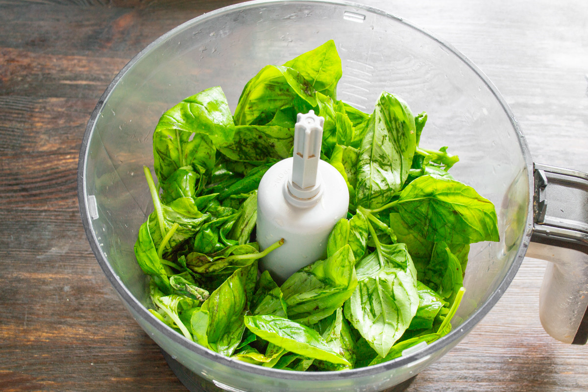 Обсушенные листья базилика помещаем в чашу блендера. Ушли в прошлое те времена, когда хозяйки растирали песто вручную. Современные кухонные помощники значительно упрощают многие рецепты.
