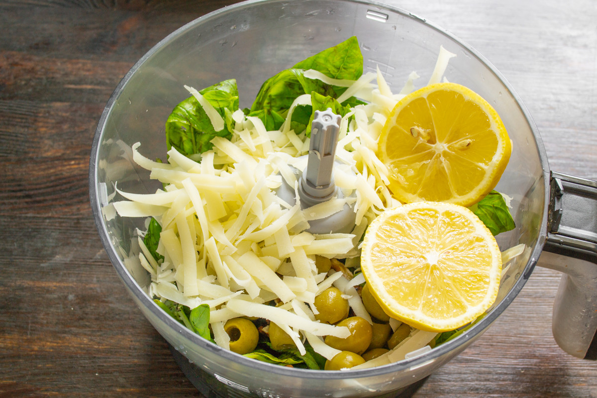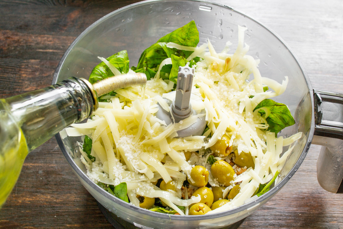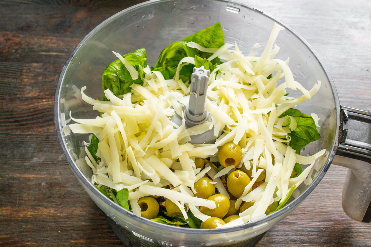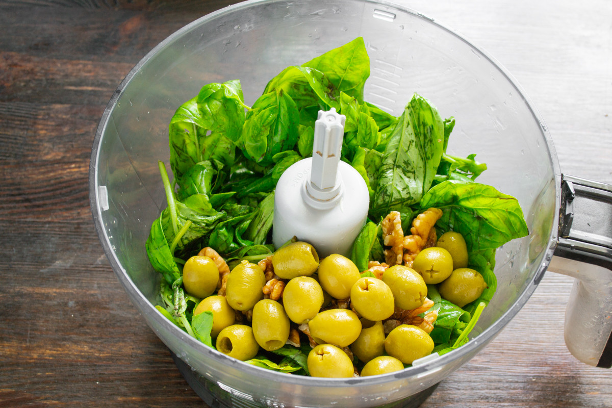 Добавляем зеленые оливки без косточек. Этот рецепт песто немного похож на французскую тапенаду. Поэтому его также вкусно съесть с несладкими крекерами или свежим багетом. Хотя в Италии предпочтут чиабатту.