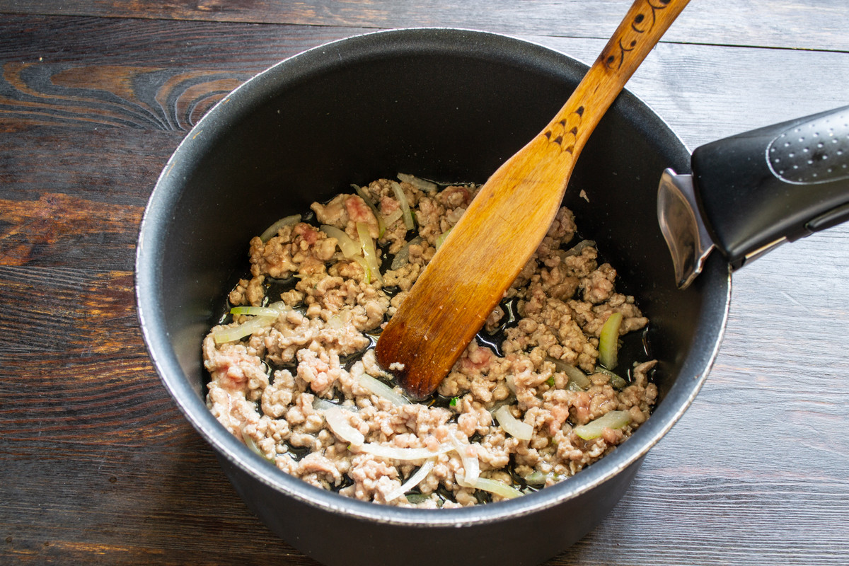 Наливаем в кастрюлю столовую ложку рафинированного растительного масла без запаха. Следом бросаем нарезанную тонкими полукольцами луковицу и измельченный зубчик чеснока. Обжариваем 3 минуты, кладем охлажденный фарш.