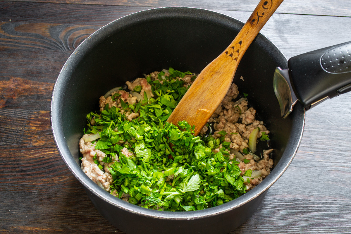 Стебли и зелень петрушки нарезаем мелко, добавляем к фаршу. Вы можете заменить петрушку сельдереем или взять понемногу того и другого.
