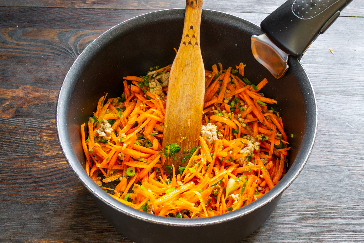 Морковку моем щеткой, скоблим, натираем на крупной овощной терке. Добавляем тертую морковку в кастрюлю. Обжариваем овощи с фаршем на сильном огне ещё несколько минут.