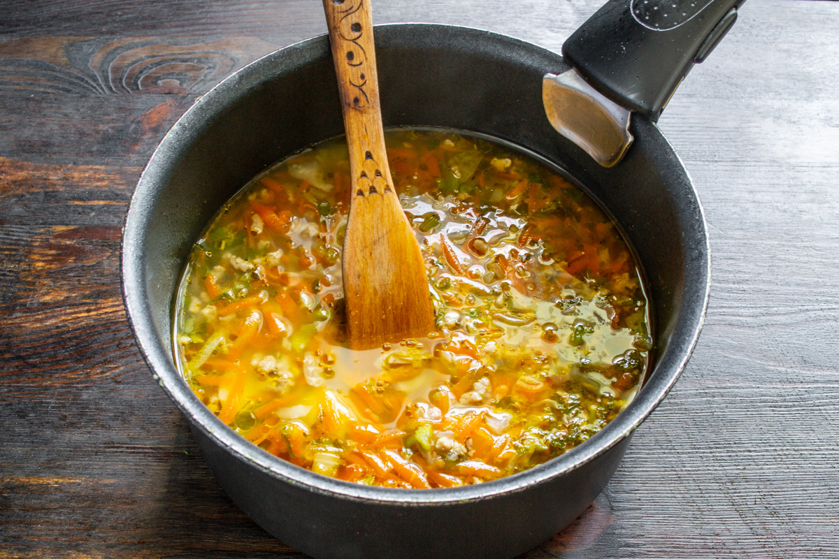 Наливаем примерно литр кипящей воды, если есть готовый мясной или куриный бульон, то используйте его. Нагреваем суп до кипения, по вкусу солим. Готовим на тихом огне 15 минут или до готовности картофеля.