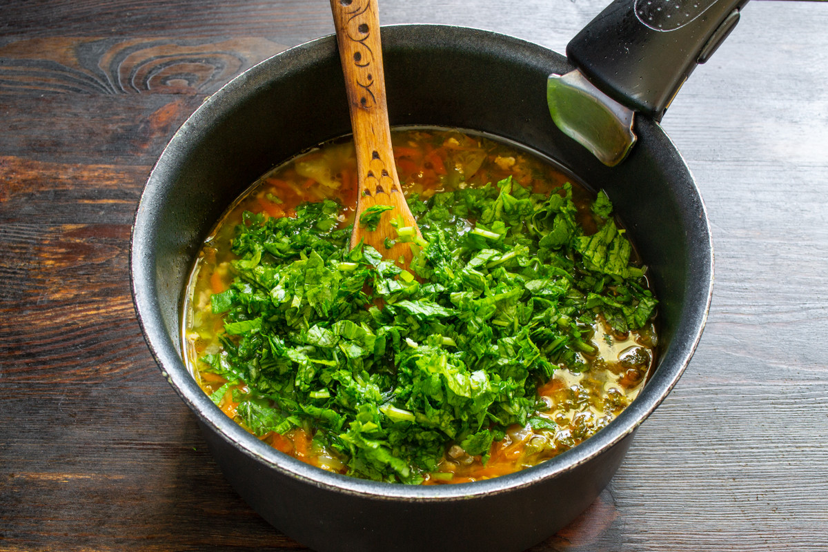 Обрываем листочки шпината со стеблей, замачиваем в холодной воде, чтобы смыть песок. Собираем шпинат в ком, отжимаем, нарезаем мелко. За 5 минут до готовности супа бросаем в кастрюлю шпинат, снова нагреваем суп до кипения. Вы можете использовать в рецепте замороженный шпинат или любую огородную зелень. К примеру, ботву свеклы или редиски.