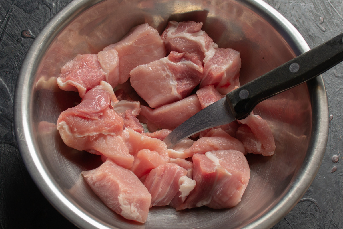 Нарезаем свинину кусочками среднего размера. Если мясо совсем без жира, советую добавить немного несолёного сала – просто нарежьте его кубиками, достаточно две столовые ложки.
