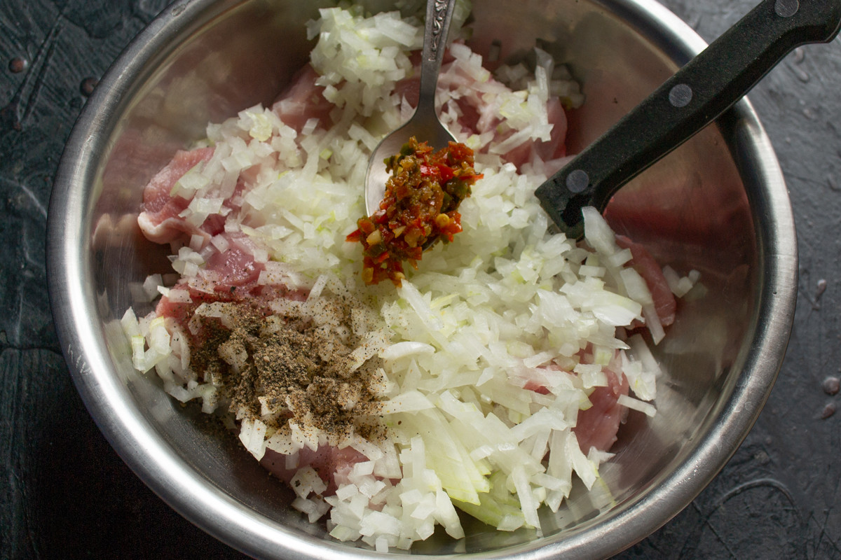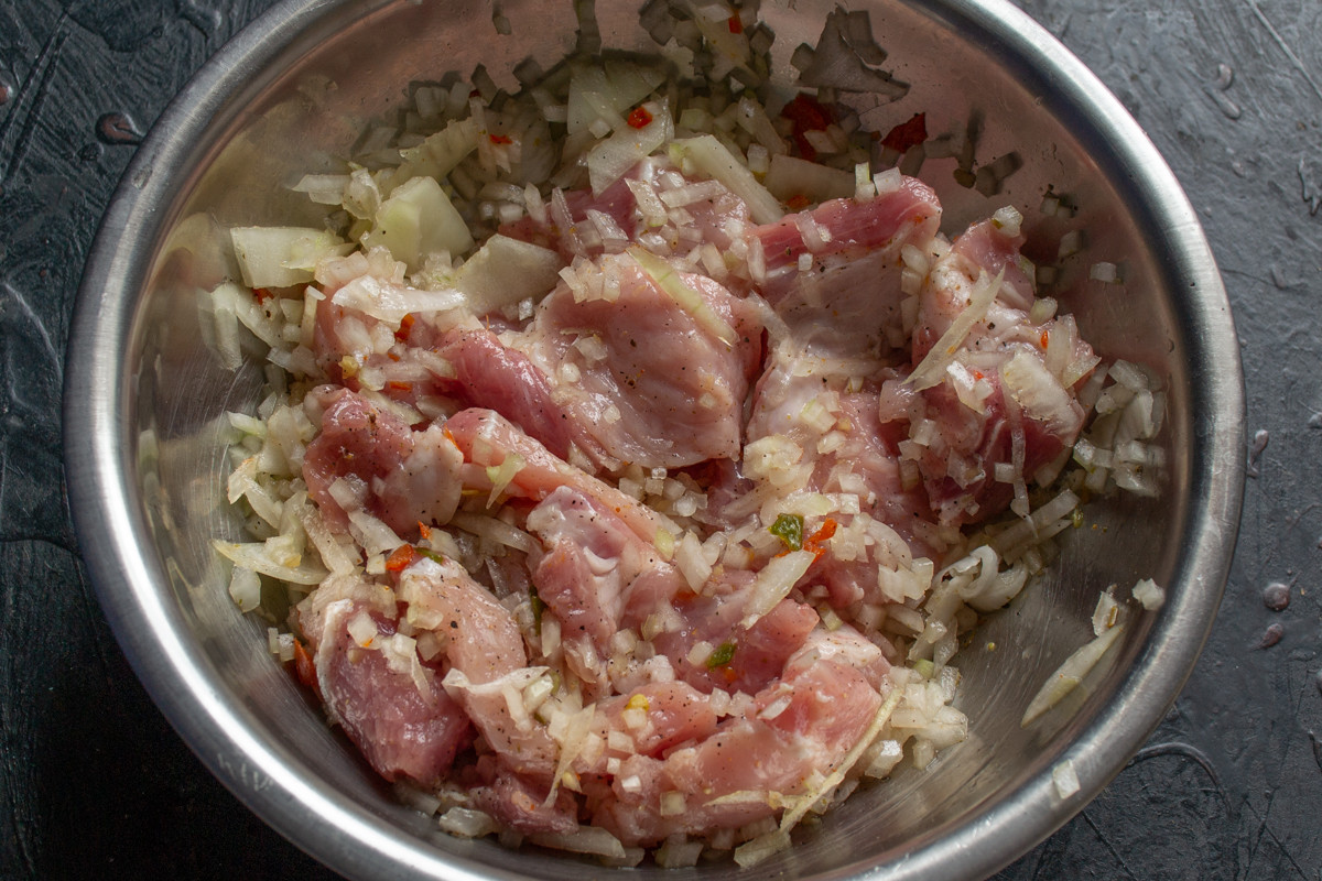Хорошо перемешиваем свинину с приправами и луком, убираем на полчаса – 40 минут в холодильник.
