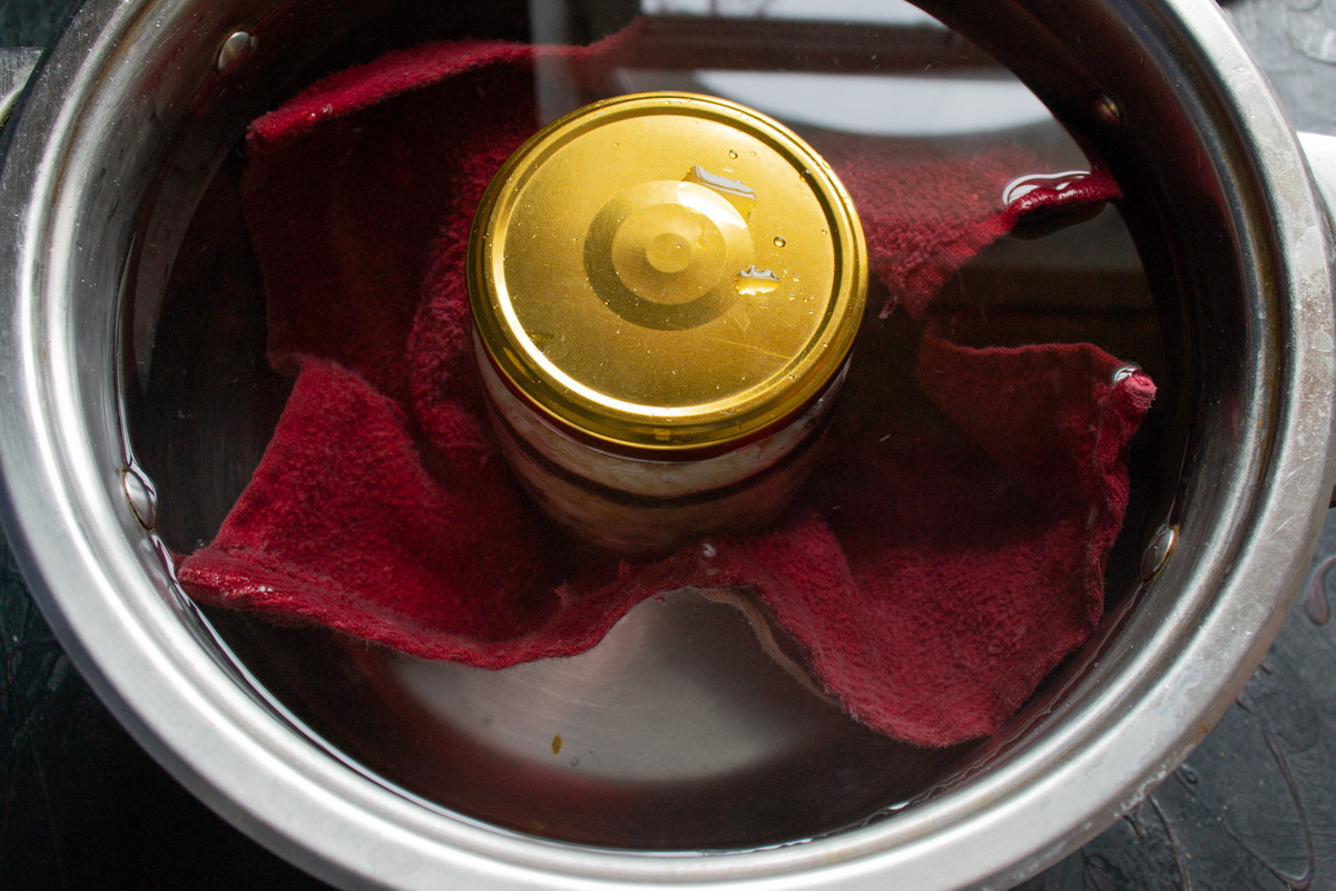 Кастрюлю кладём полотенце, ставим тушенку и заливаем холодной водой, чтобы вода закрывала крышку. Нагреваем до кипения. После закипания снижаем нагрев, чтобы вода тихо кипела и готовим примерно 4 часа. Если в процессе готовки вода выкипает и крышка оголяется, вливаем кипяток. Через 4 часа выключаем нагрев и остужаем тушенку в кастрюле.