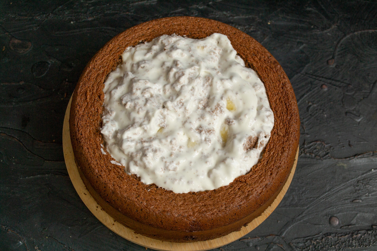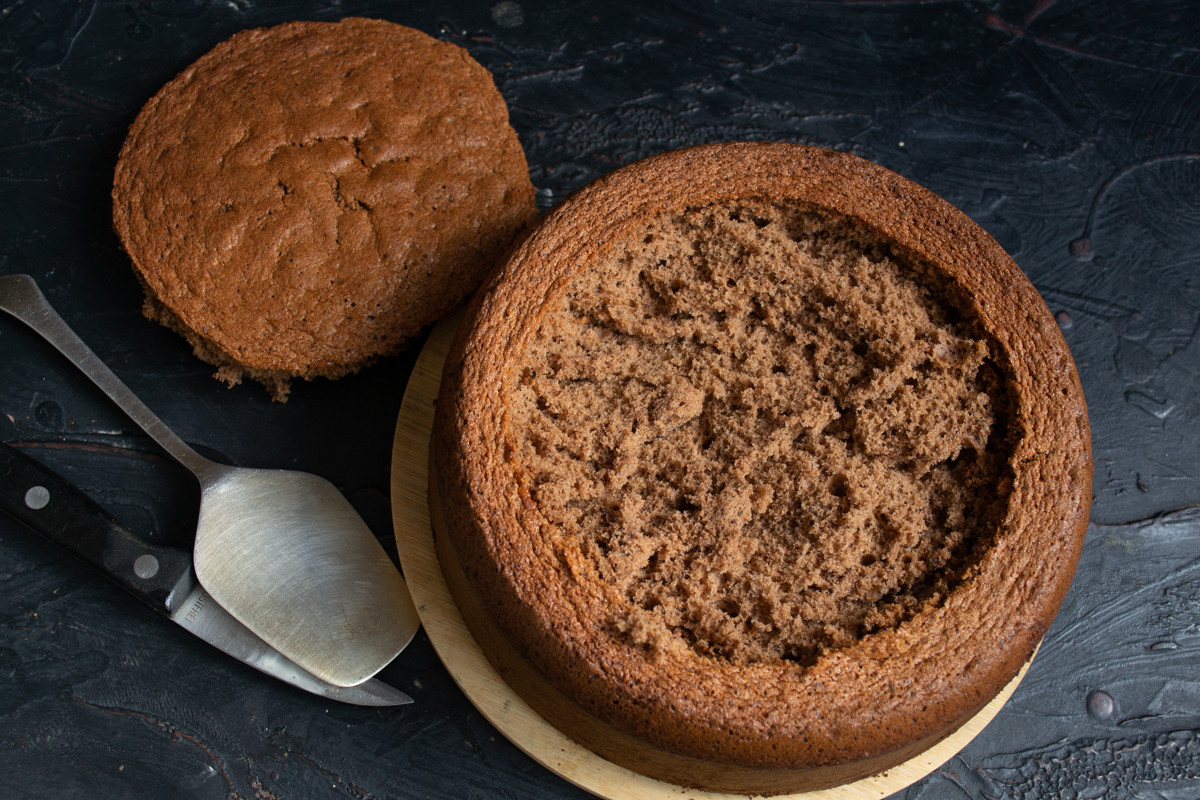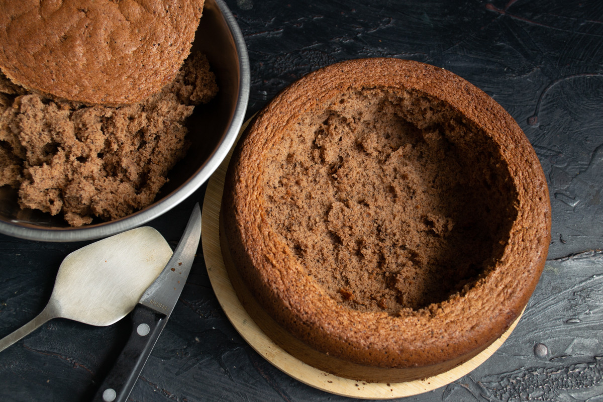 Достаём середину бисквита. Получится глубокая ёмкость с толстыми стенками из бисквитного теста. Крошки бисквита пригодятся для наполнения.