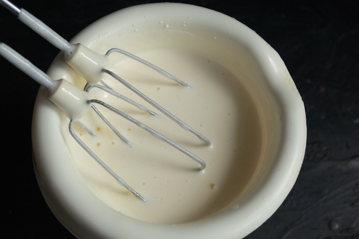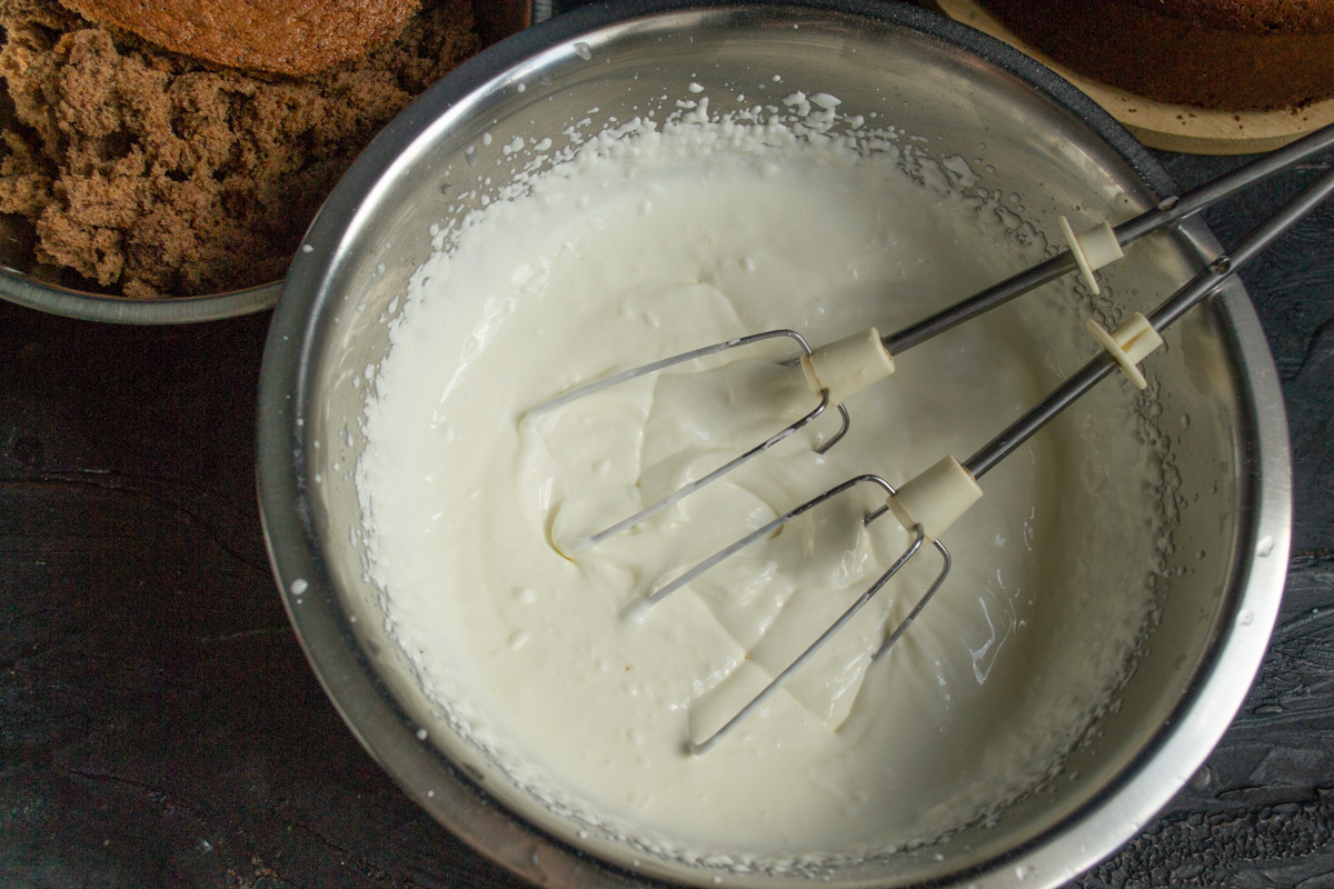 Жирную сметану, загуститель сметаны и сахарную пудру взбиваем несколько минут, пока смесь не загустеет.