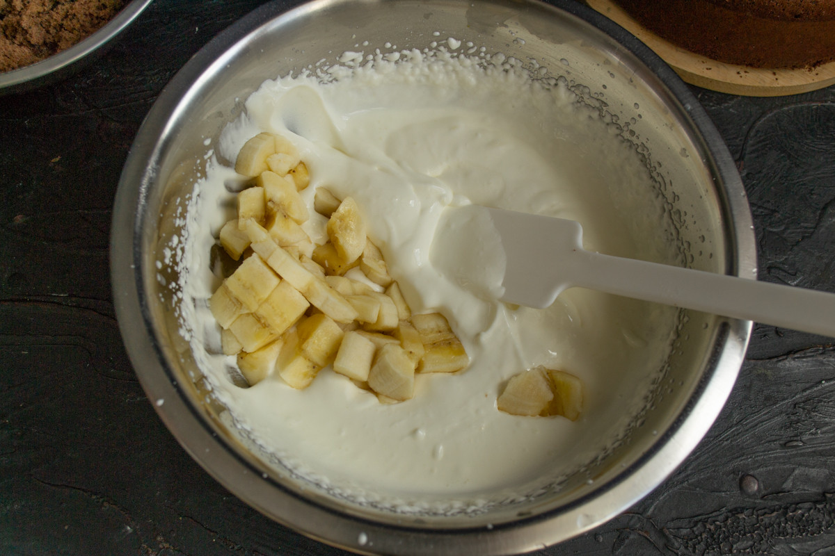 Спелые бананы нарезаем кубиками, кладём в крем. Чем спелее и мягче будут бананы, тем вкуснее получится начинка.