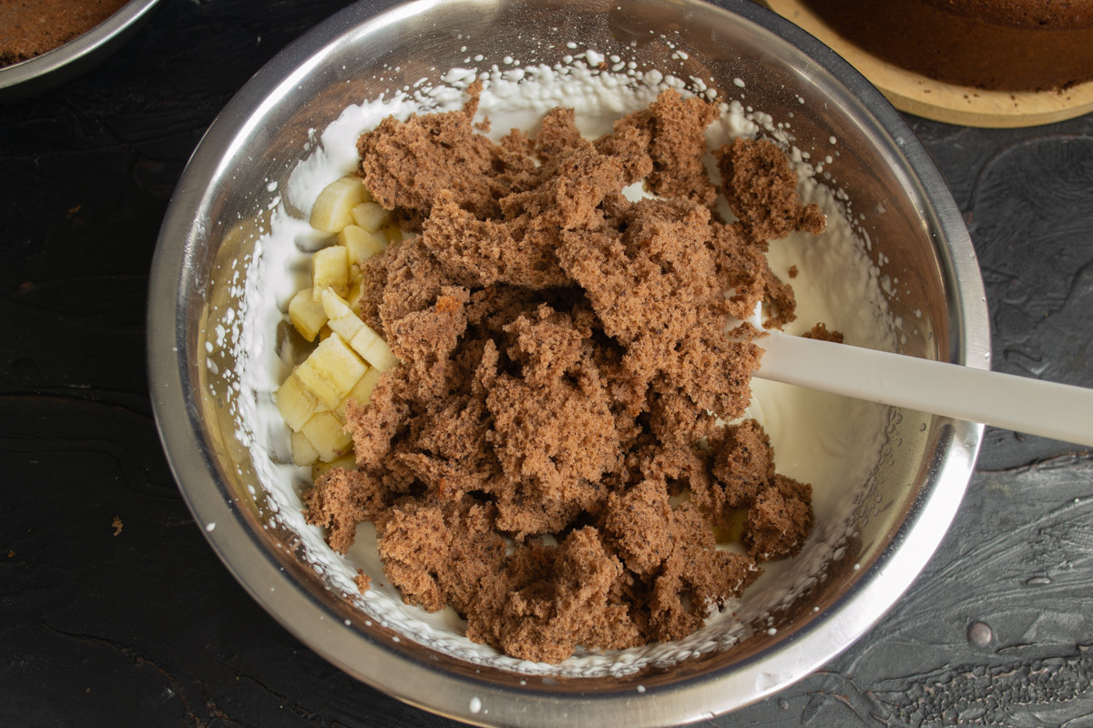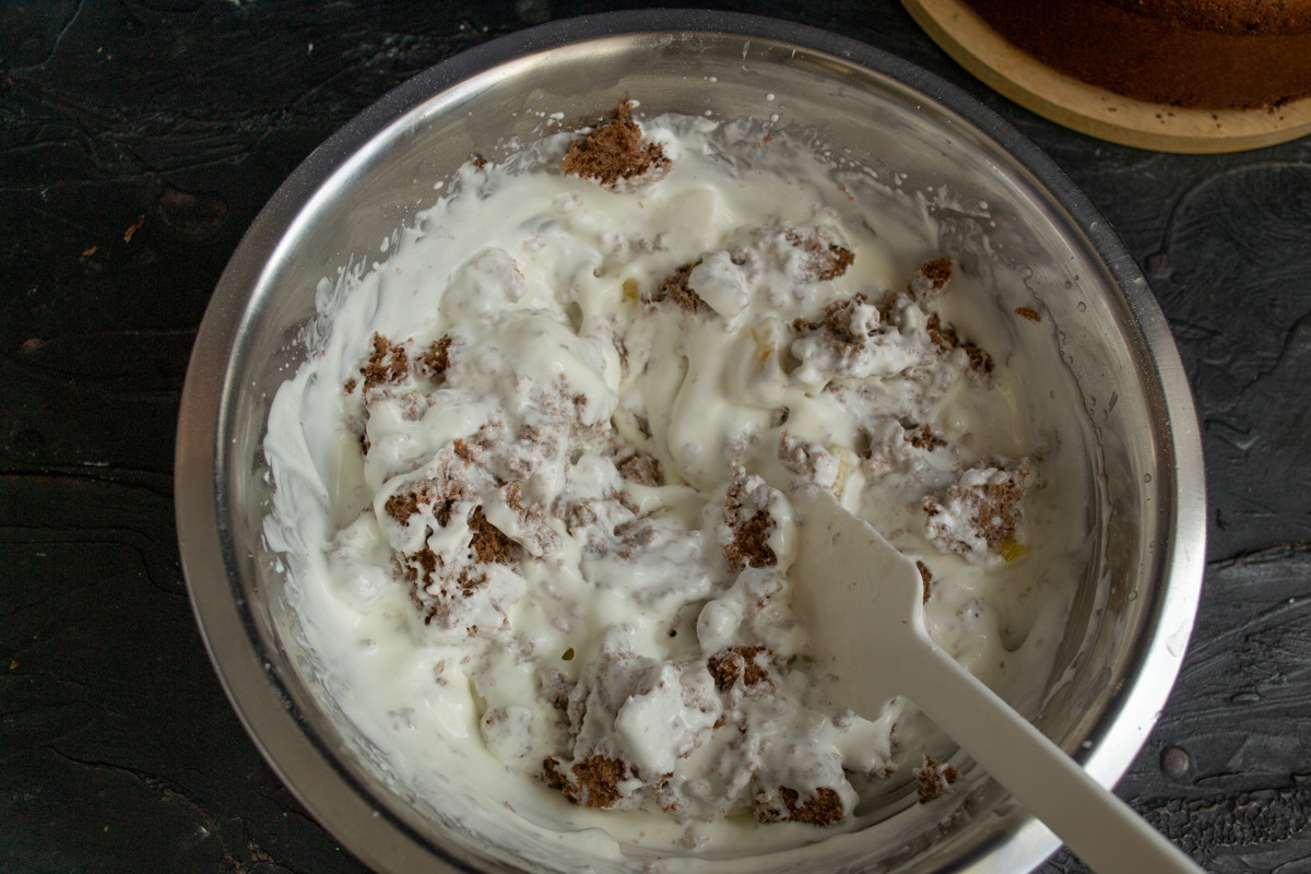 Добавляем в крем примерно половину бисквитных крошек, нарезанных мелко.