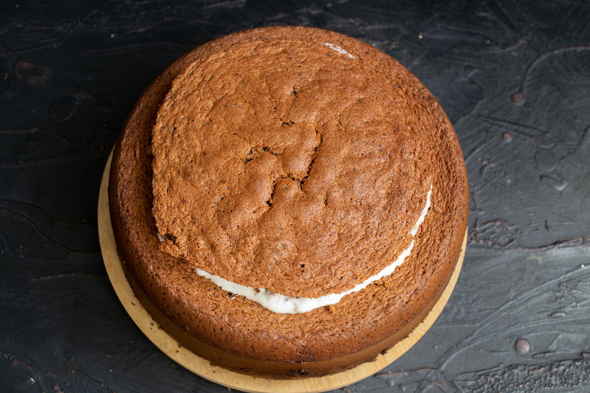 На небольшом расстоянии от края прорезаем круг. Снимаем с бисквита шапочку-крышку, откладываем в сторону.