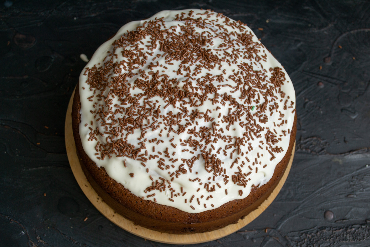 Поливаем сверху оставшимся сметанным кремом, посыпаем шоколадной вермишелью и оставляем торт «Норка крота» в холодильнике на 10-12 часов, чтобы бисквит хорошо пропитался кремом.