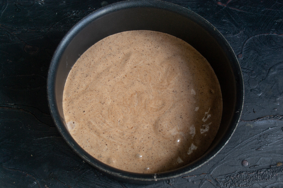 На дно формы для выпечки (в этом рецепте форма диаметром 20 сантиметров) кладём лист пергамента. Выливаем тесто и отправляем в духовой шкаф, предварительно разогретый до 180 градусов по Цельсию.