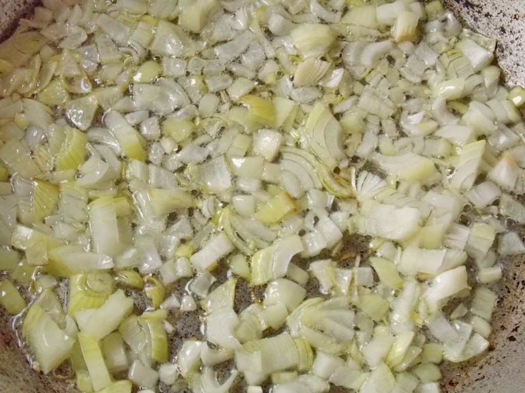 Мелко нарезав лук, выложим его на сковороду с подсолнечным маслом и пассеруем, помешивая, до лёгкой прозрачности.