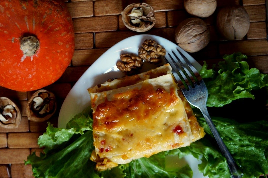 Готовую вегетарианскую лазанью с тыквой и грецкими орехами лучше подавать спустя 10 минут после приготовления, с зеленым салатом и томатным соусом. Приятного аппетита!