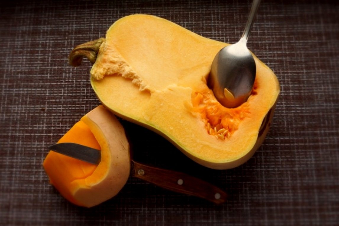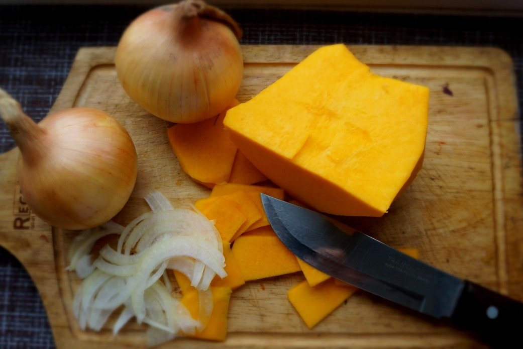 В первую очередь, следует заняться разделкой тыквы. Разрежьте плоды пополам, удалите семена, после чего очистите от шкурки и нарежьте мякоть небольшими тонкими ломтиками.