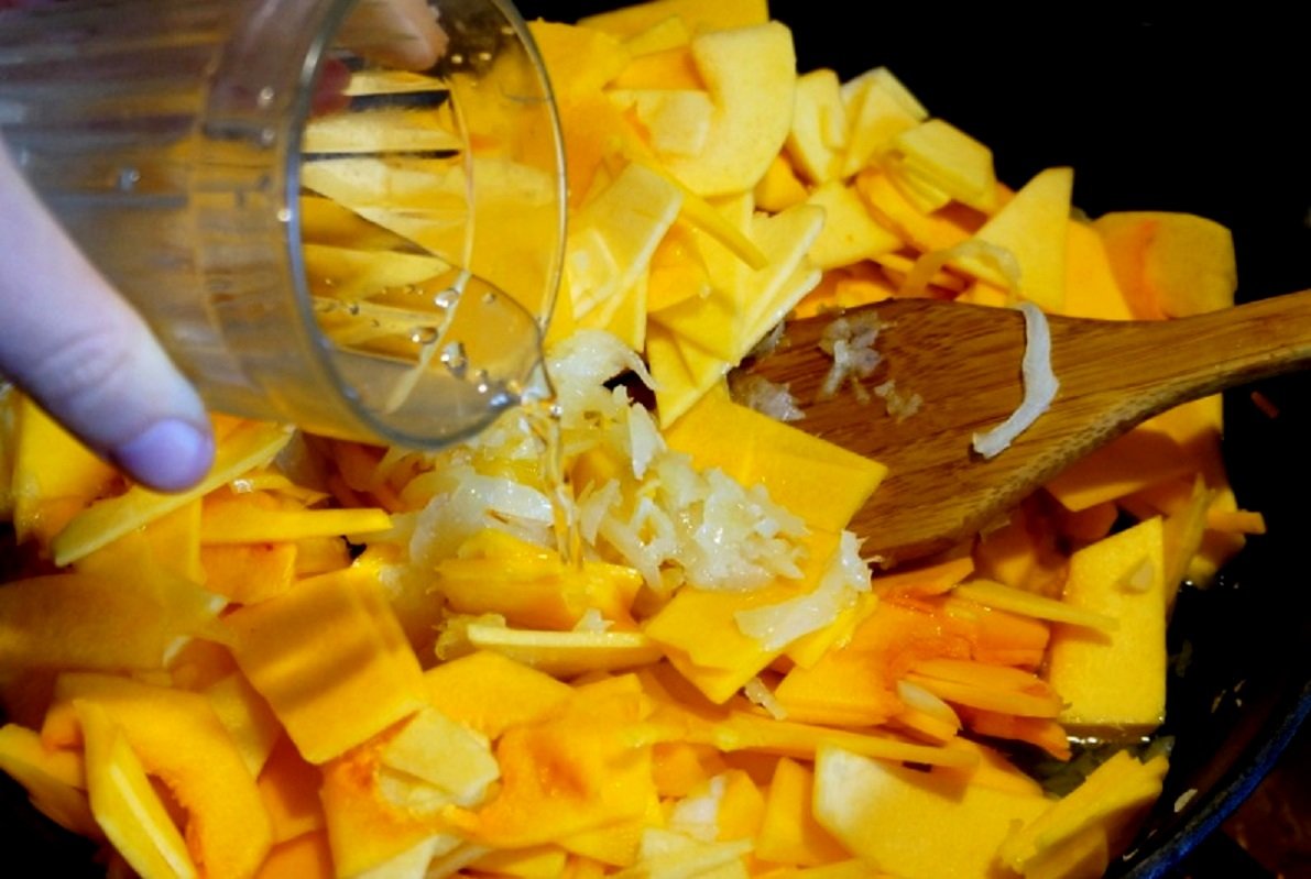 В сковороду с обжаренным луком кладем нарезанную тыкву и посыпаем измельченным чесноком (или чесночным порошком), крошим бульонный кубик и добавляем 250 миллилитров воды. Все хорошо перемешиваем и позволяем этой смеси кипеть под крышкой в течение четверти часа (15-20 минут).