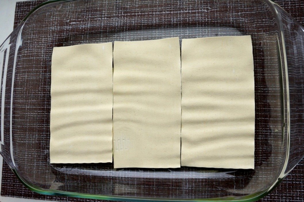 Чтобы максимально равномерно распределить начинку, сделайте предварительные расчеты, сколько слоев будет иметь готовое блюдо. Чаще всего в емкость для выпечки помещается три листа лазаньи в один слой, таким образом из 18 листов мы получим лазанью, состоящую из 6 слоев. Поэтому перед сборкой лазаньи овощную начинку нужно разделить на 5 равных частей (шестой самый верхний слой фаршем не покрывается).