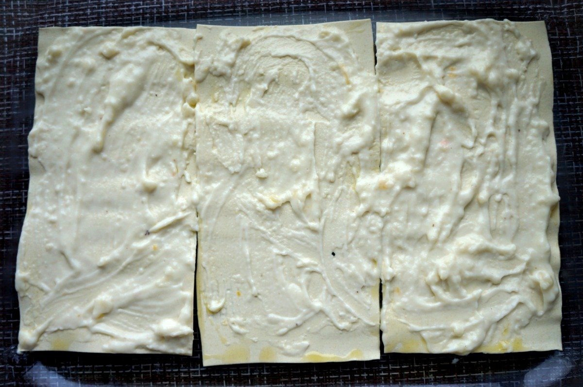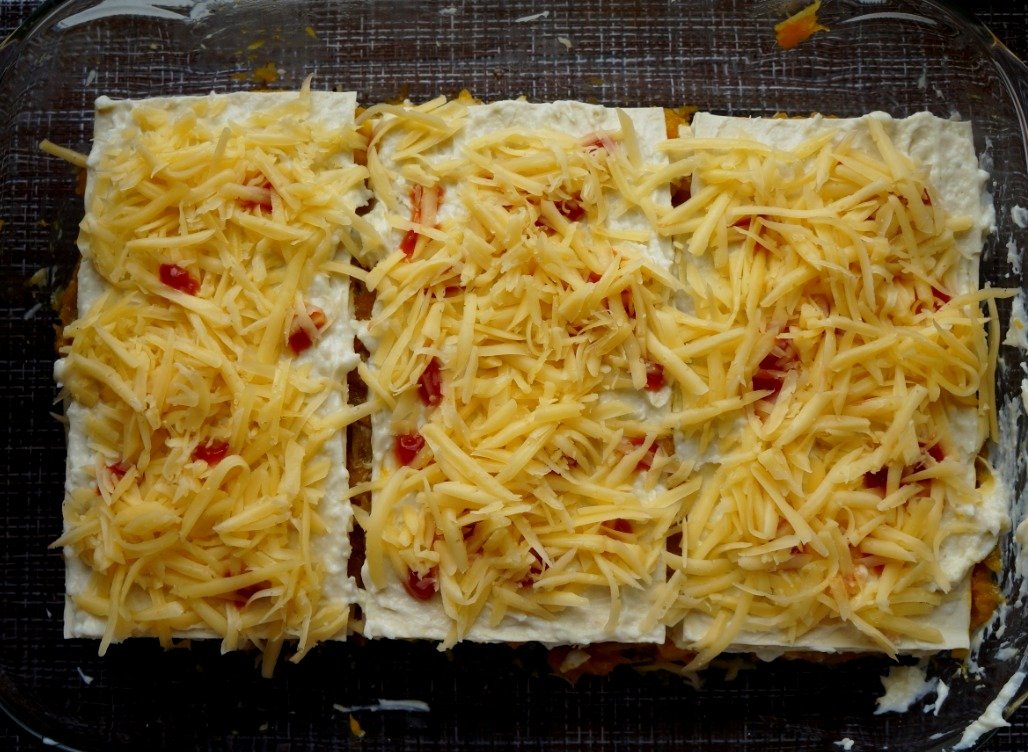 Повторяем этот шаг несколько раз пока не израсходуются все листы и не закончится начинка. Очень важно хорошо промазывать соусом и покрывать начинкой уголки и края листов, иначе они получатся суховатыми.