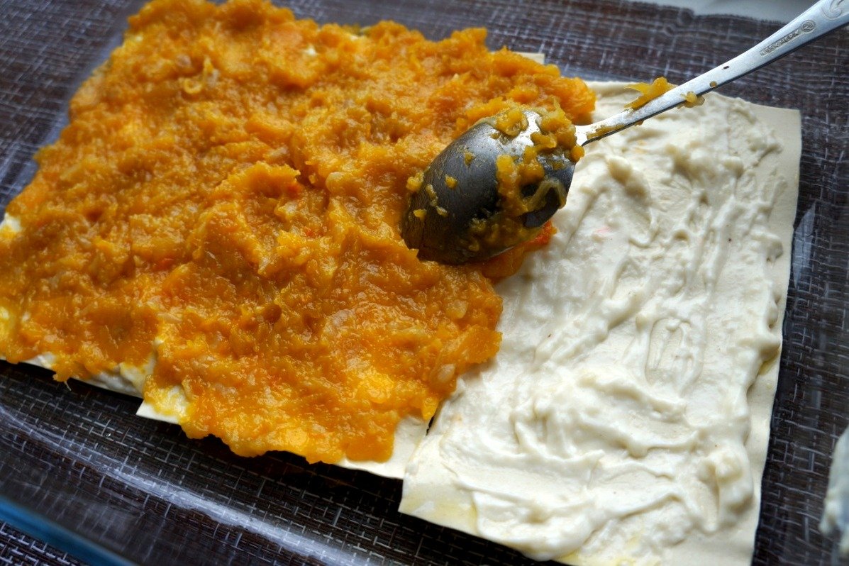 Выкладываем на дно несколько листов лазаньи в один слой (сколько вмещает посуда), намазываем листы соусом, а сверху выкладываем слой «фарша» из тыквы и лука.