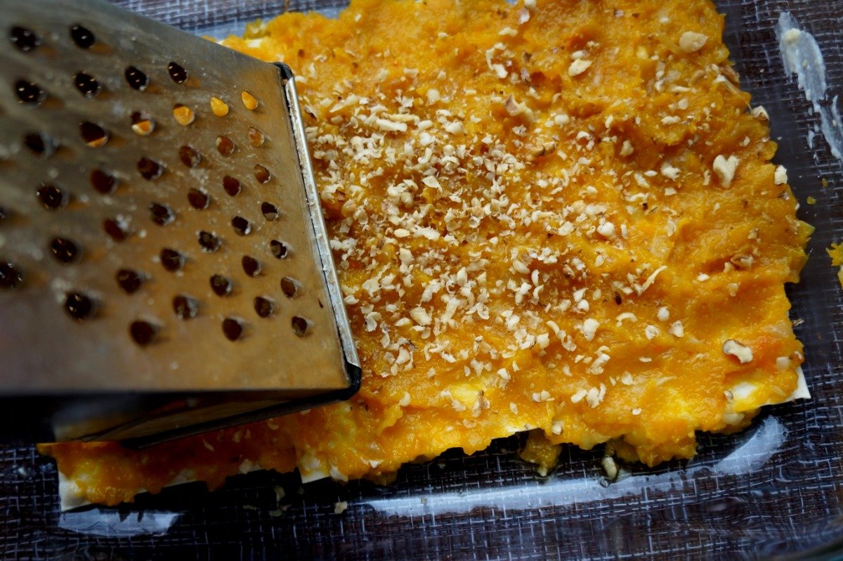Затем добавляем нарезанные грецкие орехи или натираем ядра орехов на терке непосредственно над лазаньей.