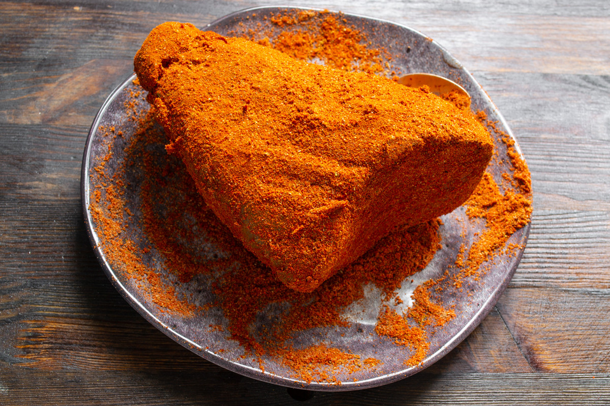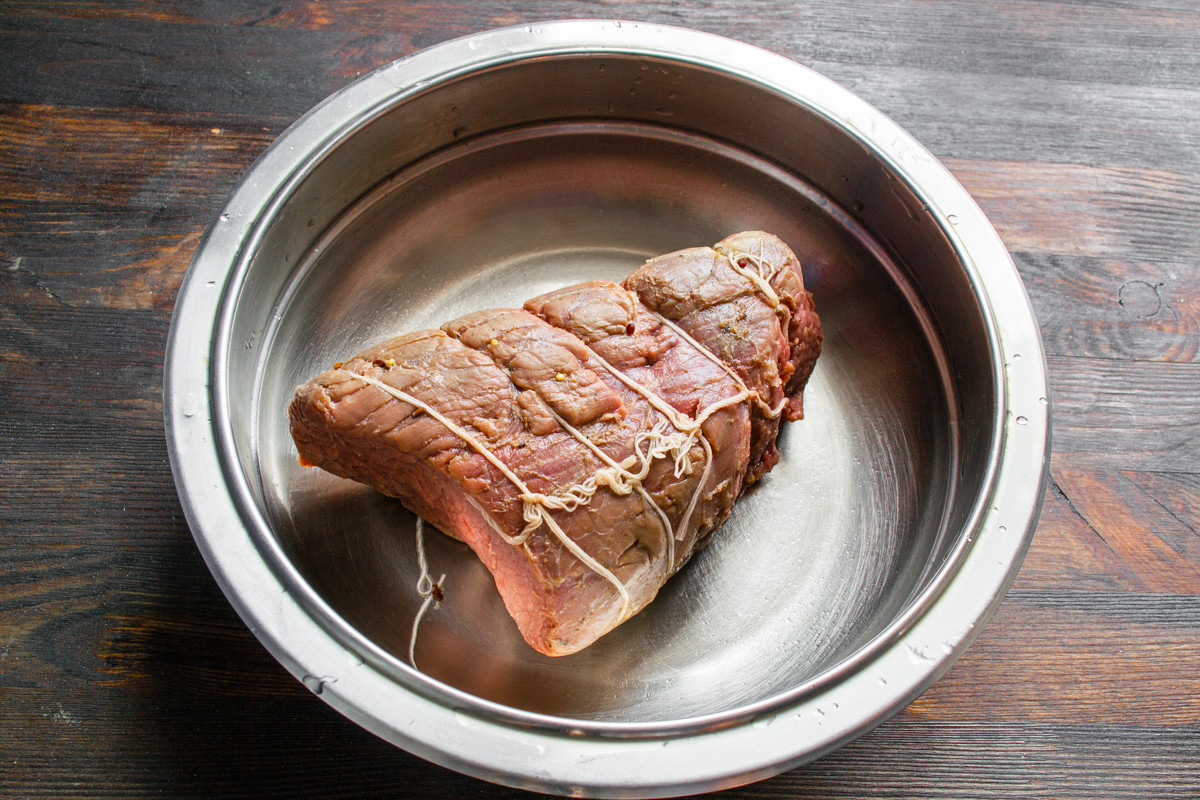 Маринуем говядину 48 часов: на 4 часа оставляем при комнатной температуре, на оставшееся время убираем в холодильник. Периодически переворачиваем мясо, чтобы равномерно просаливалось.