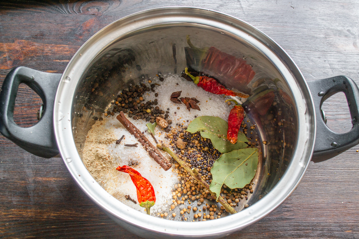 Готовим маринад для мяса. Насыпаем в большую кастрюлю соль и сахар. Добавляем лавровые листья вместе с веткой, палочку корицы и бадьян. Насыпаем по чайной ложке семян горчицы, кориандра и горошины черного перца. Кладем стручки сушеного перца чили.