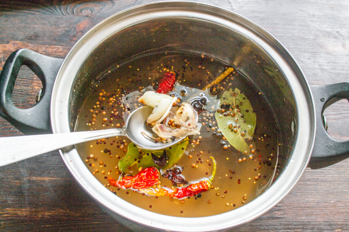 Дольки чеснока давим вместе с шелухой, добавляем в маринад. Вливаем полтора литра воды, нагреваем до кипения. Готовим 2-3 минуты. Снимаем кастрюлю с огня, остужаем маринад до комнатной температуры.