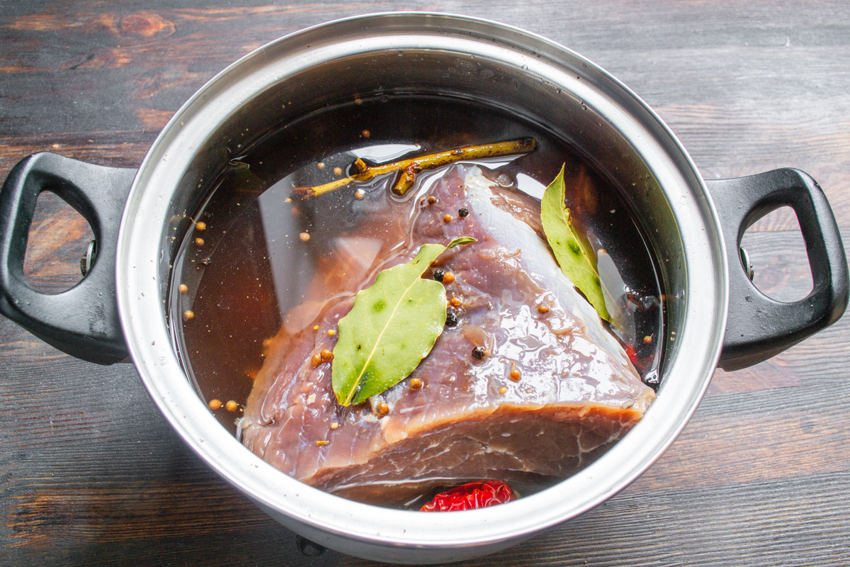 Кладем кусок говядины в кастрюлю с остывшим маринадом. Вода должна полностью закрывать мясо. Если воды не хватает, то долейте холодную кипяченую или фильтрованную воду.