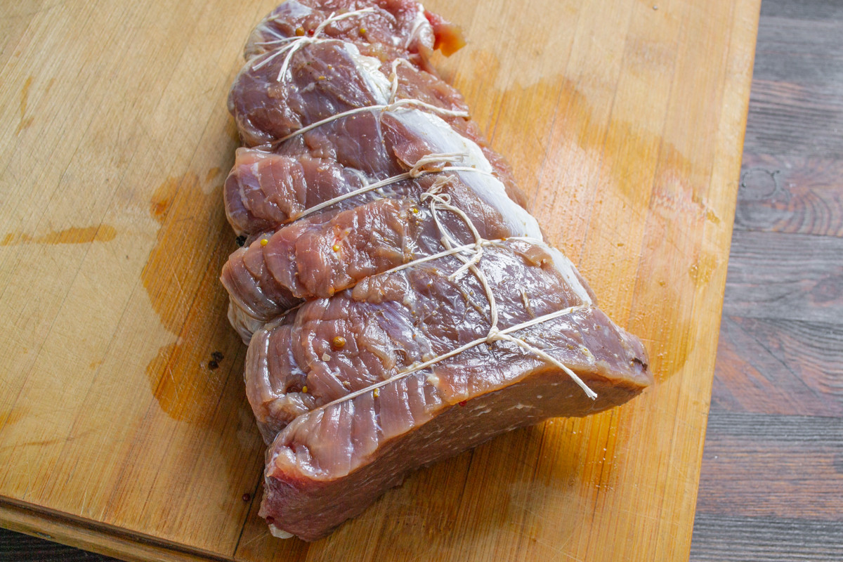 Через 48 часов обмываем мясо холодной водой, обсушиваем бумажным полотенцем. Плотно перевязываем говядину кулинарной нитью в нескольких местах.