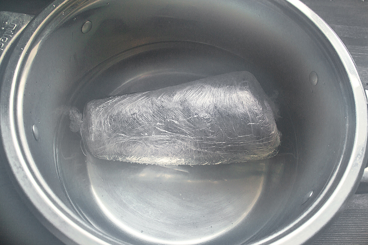 Упакованную говядину кладем в большую кастрюлю, наполненную горячей водой (температура 75-80 градусов по Цельсию). Я для надежности дополнительно увязываю мясо в несколько слоев пищевой пленки и связываю края ниткой.