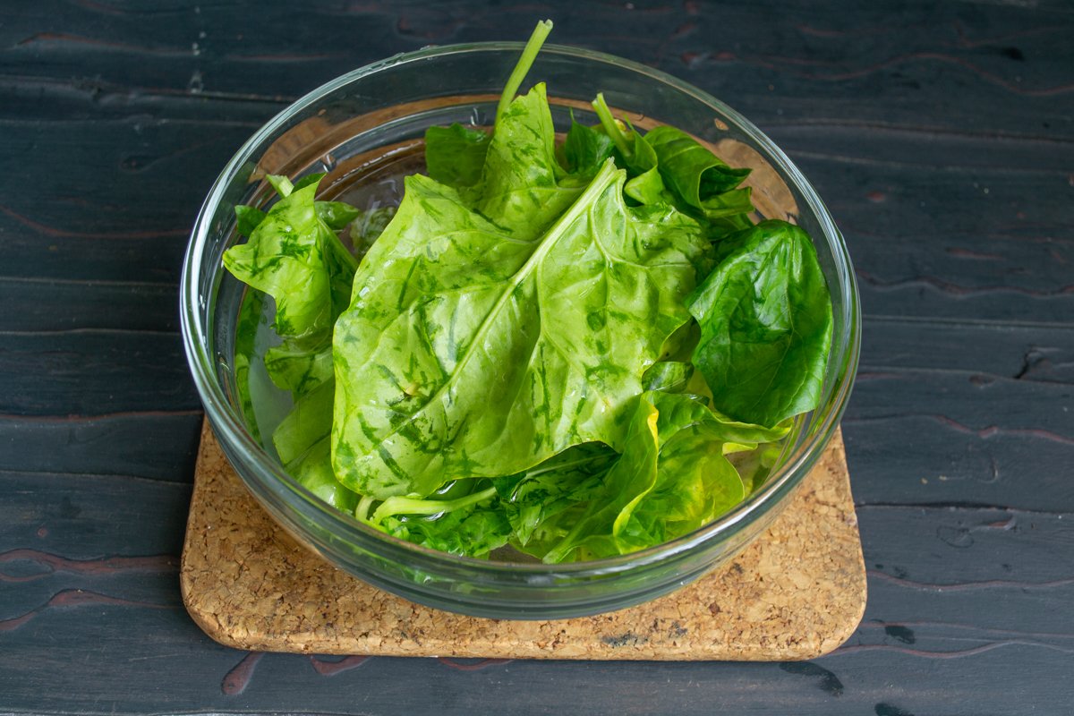 Я готовила со свежим шпинатом, замороженный тоже подойдет. Итак, свежие листочки кладём в миску с водой на пару минут, промываем, затем ополаскиваем проточной водой. Для этого рецепта омлета со шпинатом я не использую сушилку для салата: во-первых, долго, а во-вторых, лишнюю посуду мыть не хочется. Но воду с листьев нужно как-то убирать. Собираем промытый шпинат в кулак и отжимаем как тряпку. В результате почти сухие листочки, правда изрядно помятые. Для салата такой способ не очень подходит, а для омлета — в самый раз.