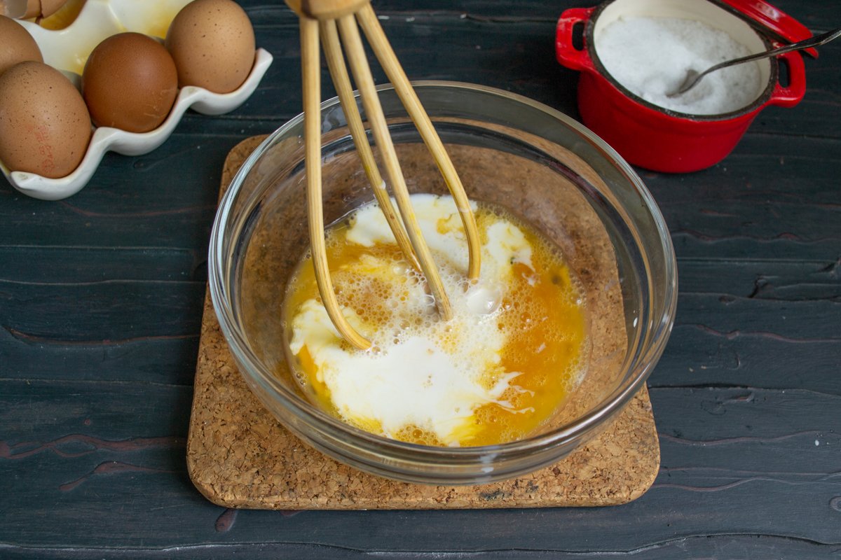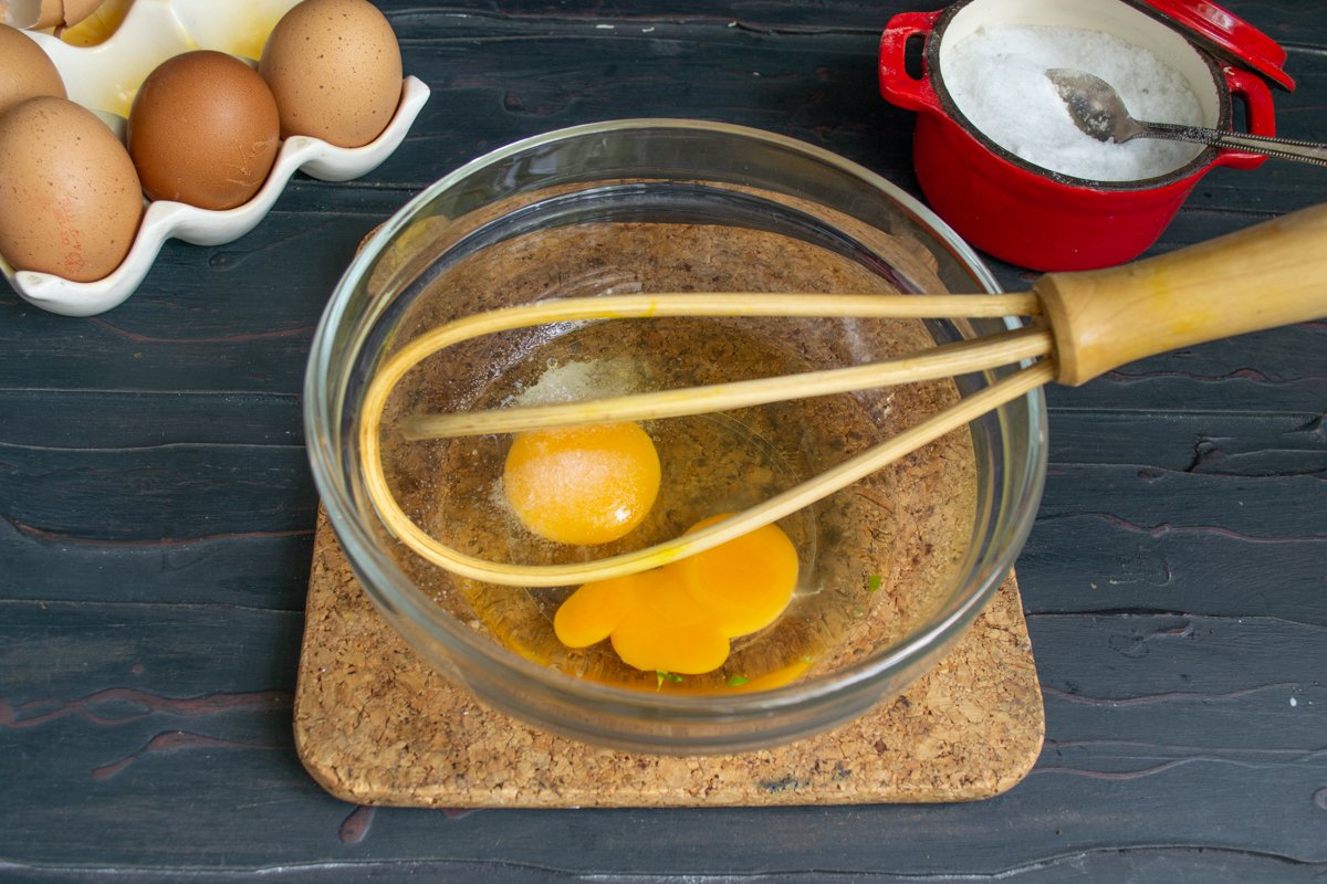 В миску разбиваем свежие куриные яйца, насыпаем щепотку соли, взбиваем венчиком. Не нужно добиваться пышной пены, только разрушить структуру яйца и получить однородную массу.