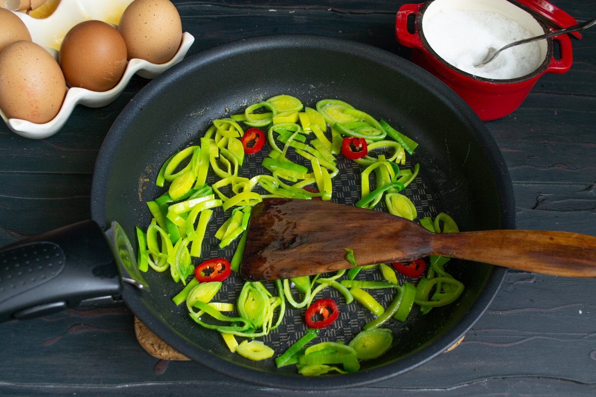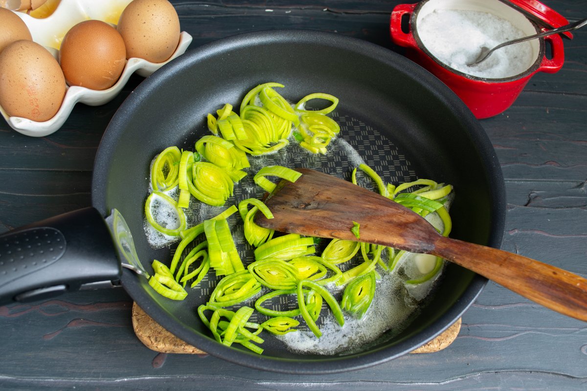 Лук порей промываем проточной водой — между листьями может попадаться почва. Промытый порей нарезаем тонкими кольцами. Смазываем сковороду растительным или оливковым маслом, кладём сливочное масло и нарезанный лук-порей. Обжариваем 2-3 минуты на небольшом огне.