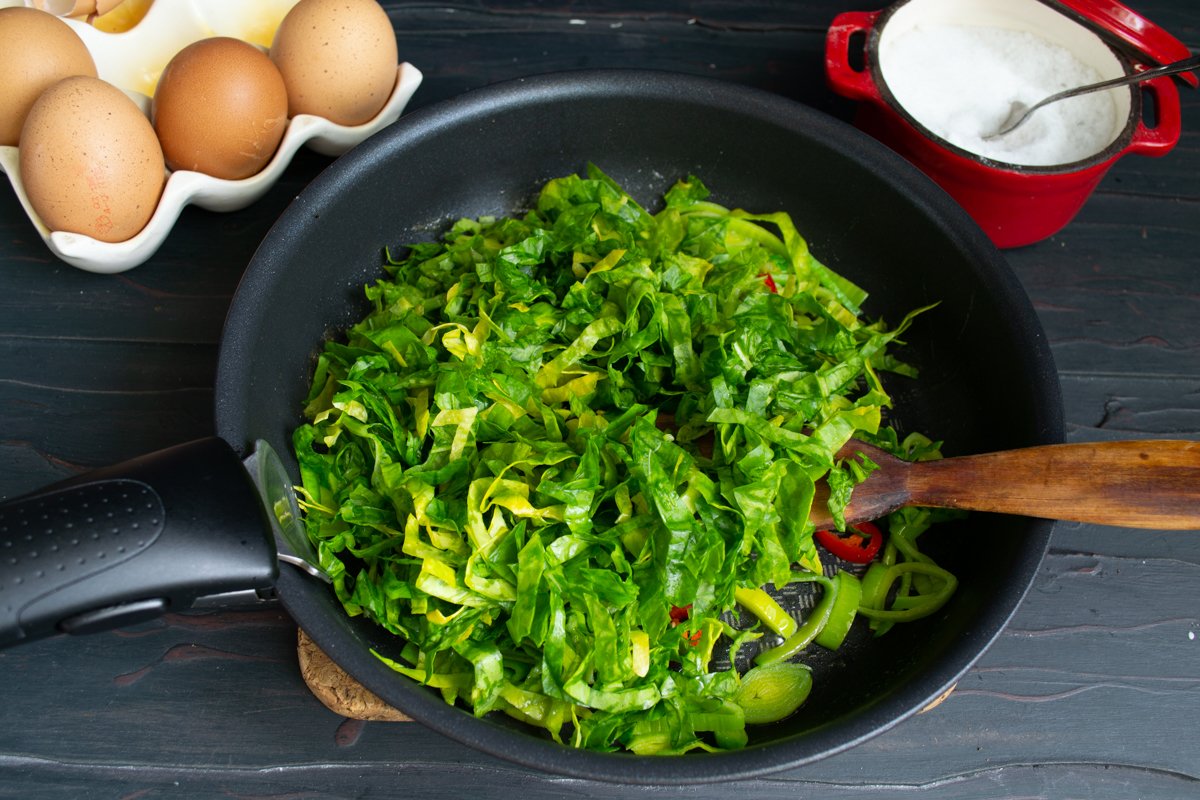 Отжатый шпинат режем полосками, отправляем в сковороду следом за чили, посыпаем щепоткой соли.
