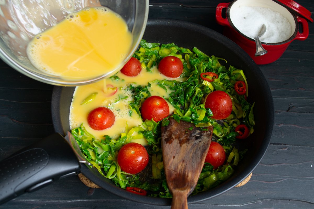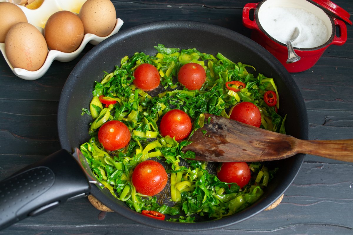 Небольшие помидоры разрезаем пополам. Обжариваем зелень 2 минуты, добавляем помидоры, кладём их срезом вниз. Для этого рецепта омлета со шпинатом подойдут помидоры черри, их можно готовить целиком.