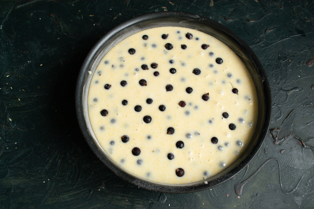 Выливаем тесто в форму, сверху посыпаем смородиной. При выпечке все ягоды, что находятся в тесте, там и останутся, а те, что насыпаны сверху, чуть утонут, но будут заметны.