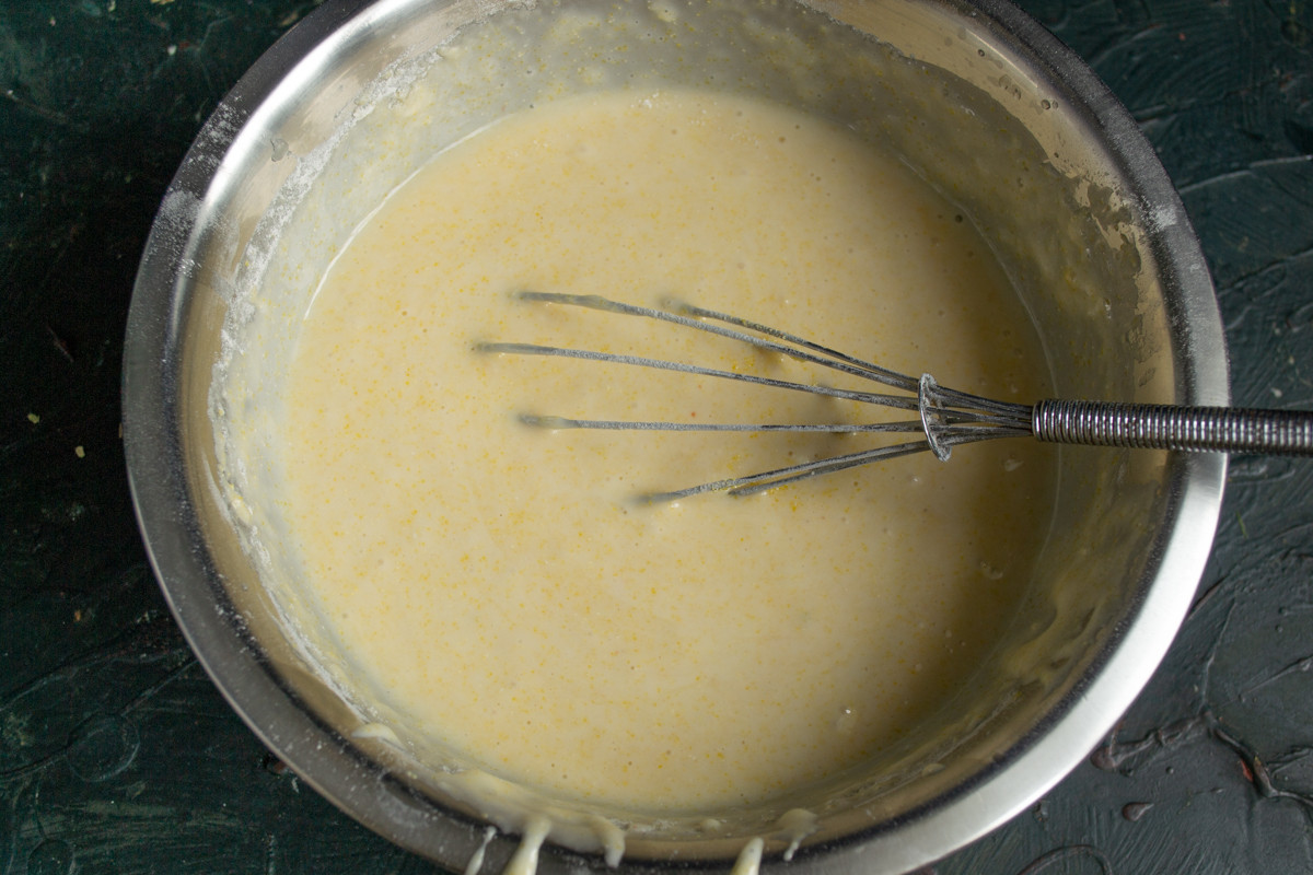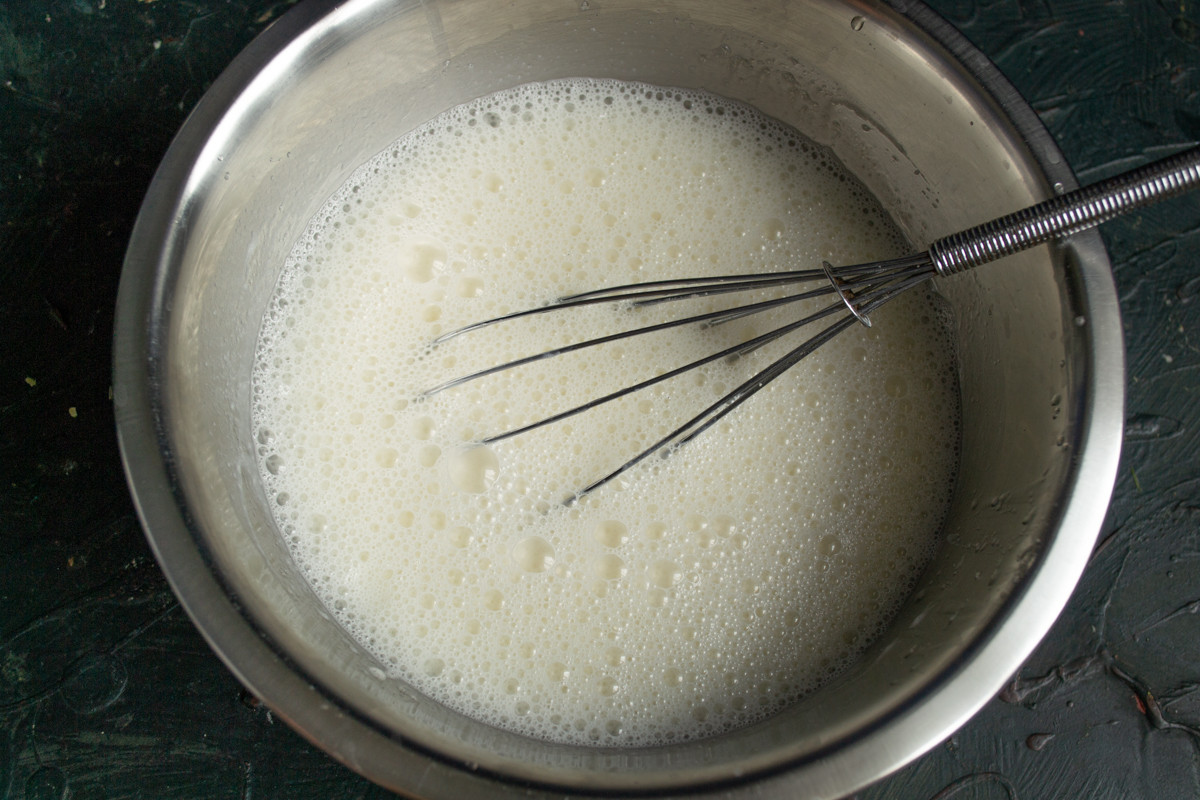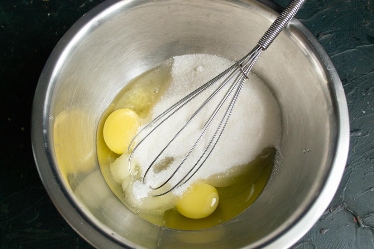 Хорошо перемешиваем ингредиенты, на этом этапе советую использовать миксер или погружной блендер. Так крупинки сахара быстрее растают и можно будет добавить сухие ингредиенты.