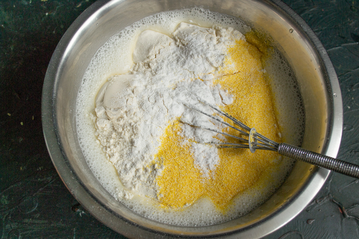 Насыпаем пшеничную муку высшего сорта, разрыхлитель теста и кукурузную муку. Вместо кукурузной муки можно взять кукурузную поленту мелкого помола, только не кукурузную крупу!