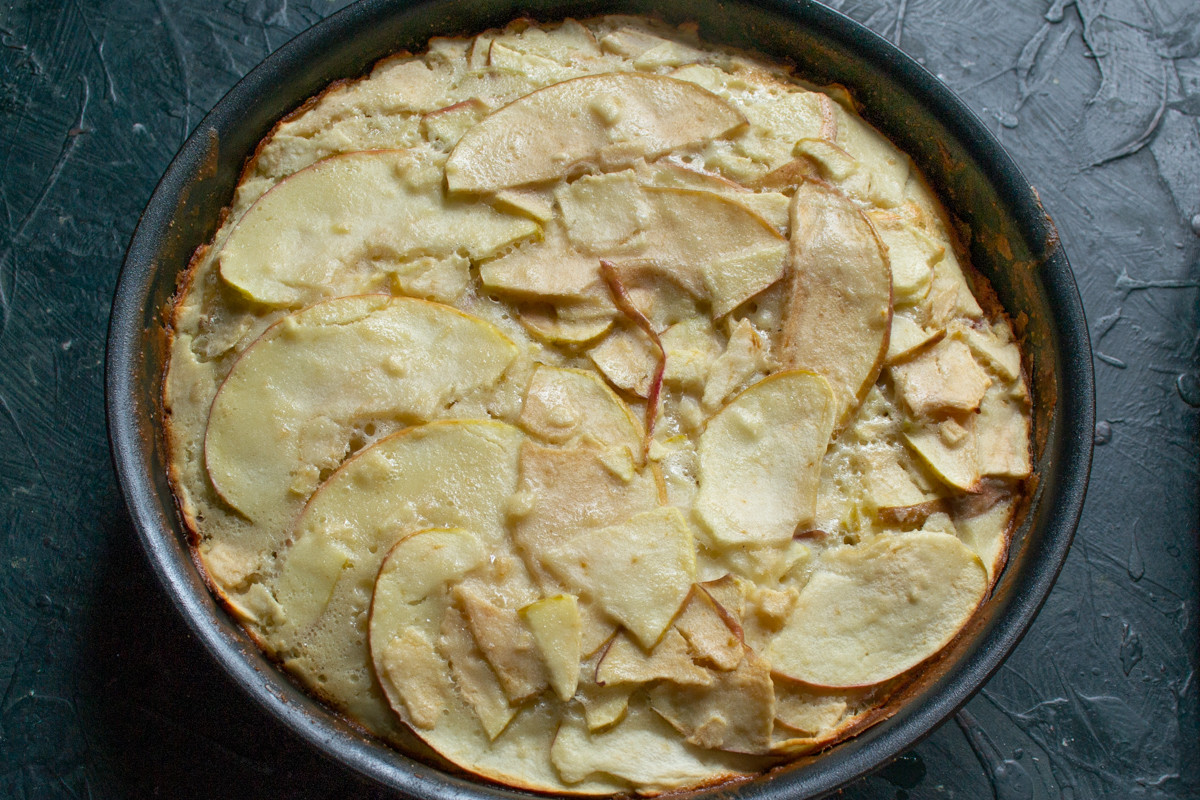 Достаём пирог из духовки. По фото понятно, для чего нужен штрезель. В короткий срок от яблок невозможно добиться аппетитной корочки.