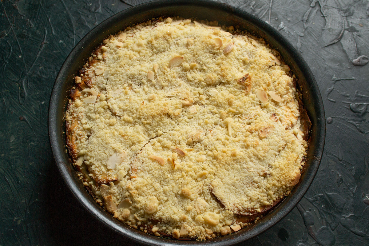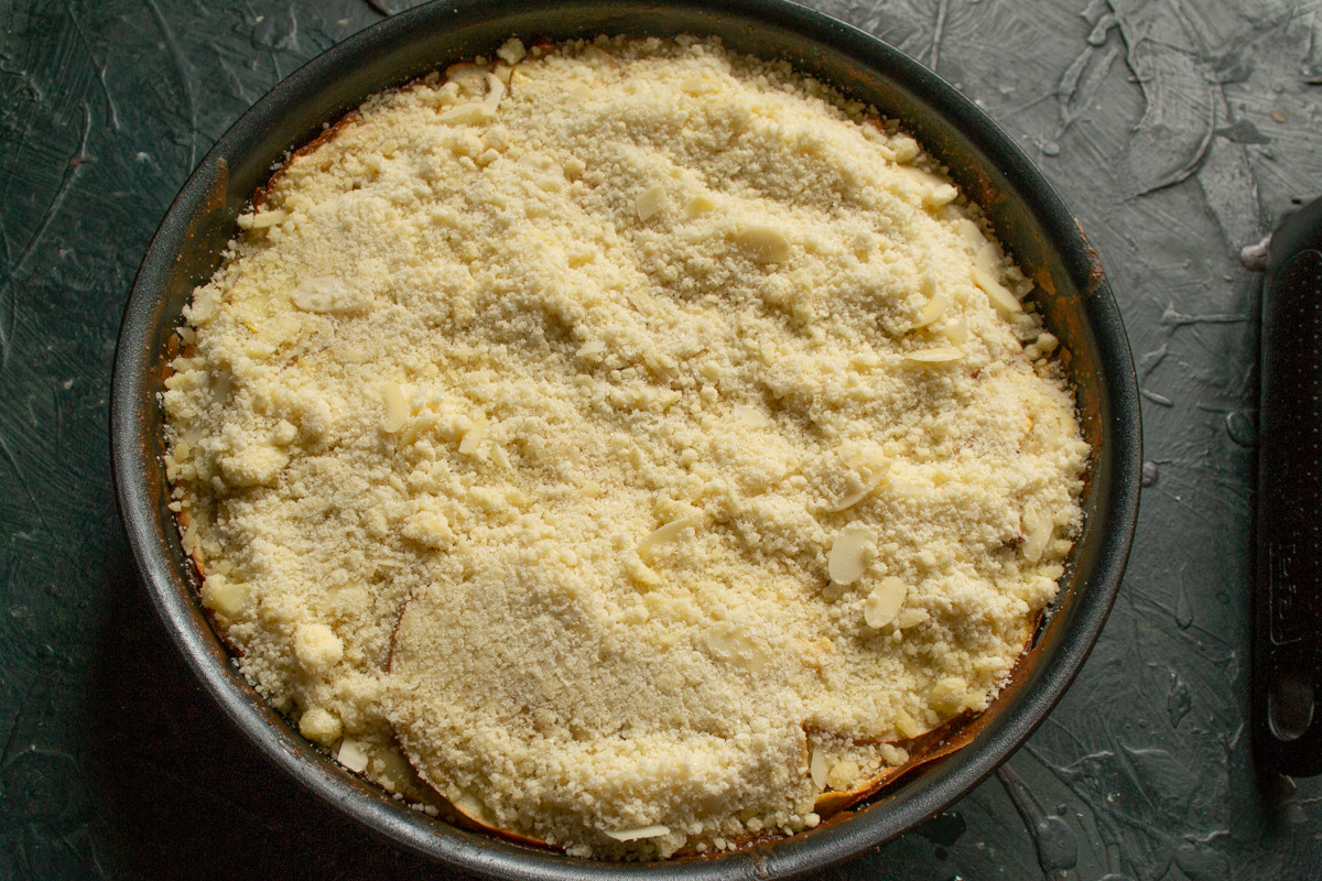 Посыпаем горячий пирог штрейзелем, распределяем крошки ровным слоем.