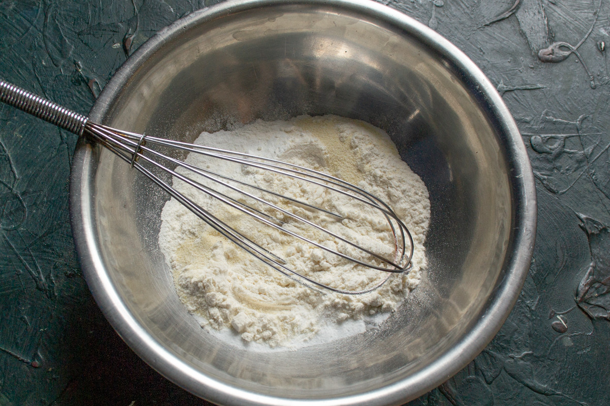 Делаем тесто. Смешиваем сухие ингредиенты: пшеничную муку с манной крупой и разрыхлителем теста. Немного манной крупы в тесте никогда не помешает, но если не любите манку, то просто возьмите больше муки.