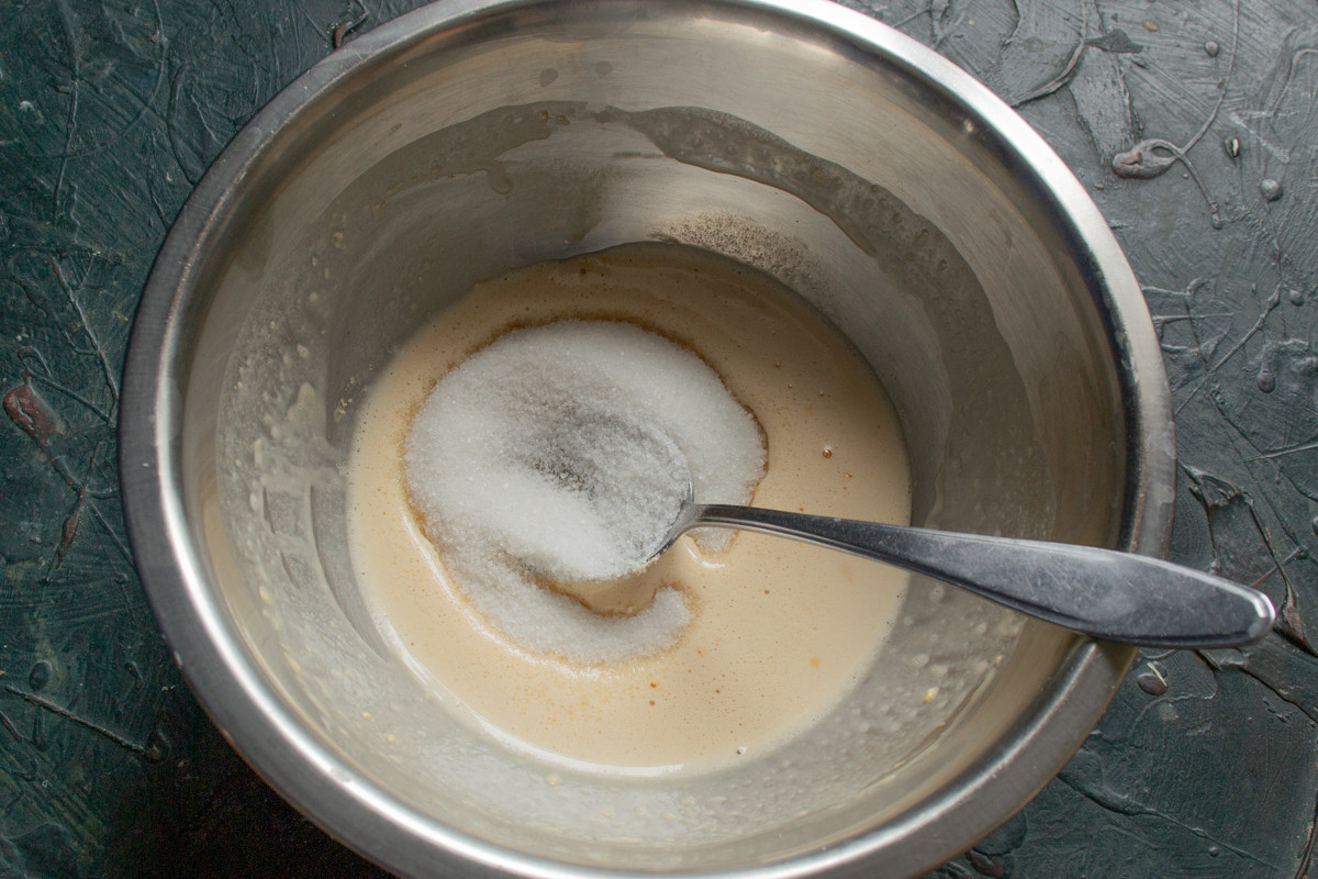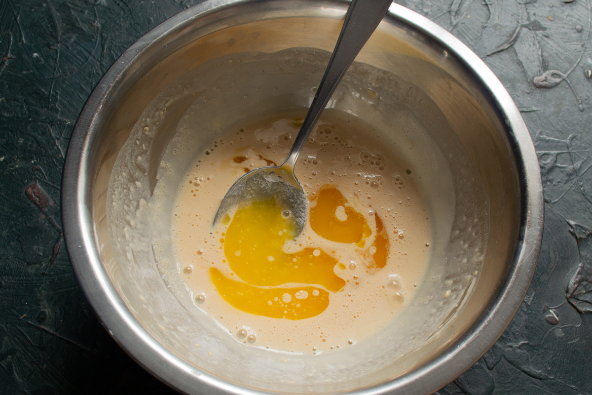 Растапливаем и немного остужаем сливочное масло. Добавляем масло к яйцам и сахару, вливаем молоко. Хорошо перемешиваем жидкие ингредиенты венчиком.
