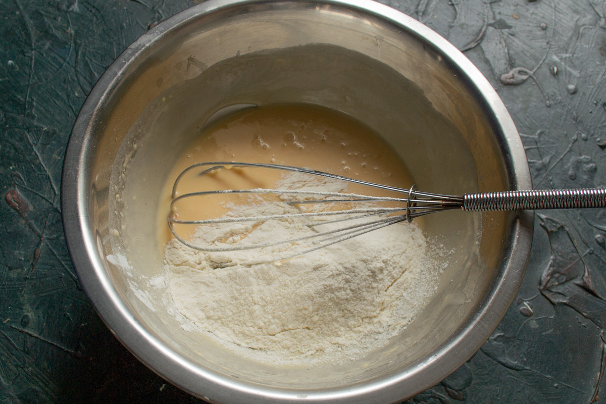 Насыпаем пшеничную муку с приправами в миску с жидкими ингредиентами.