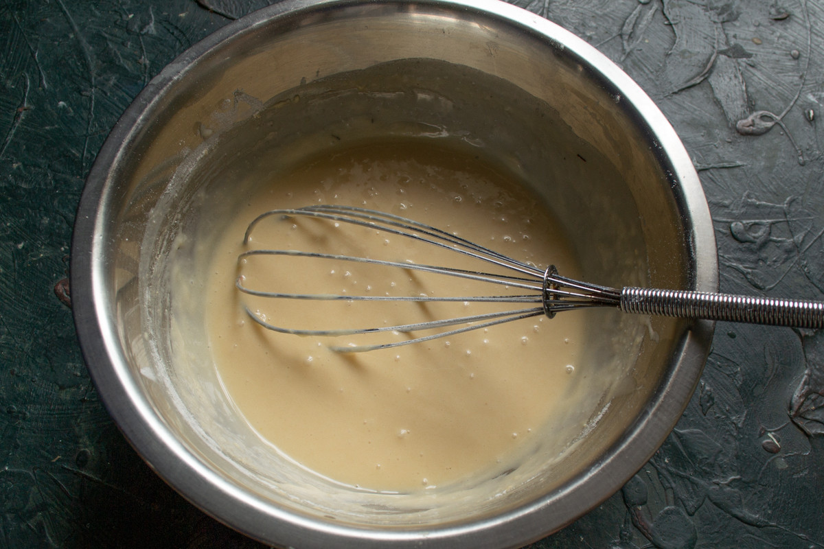 Замешиваем тесто, оно получается жидким, по консистенции похоже на блинное тесто.