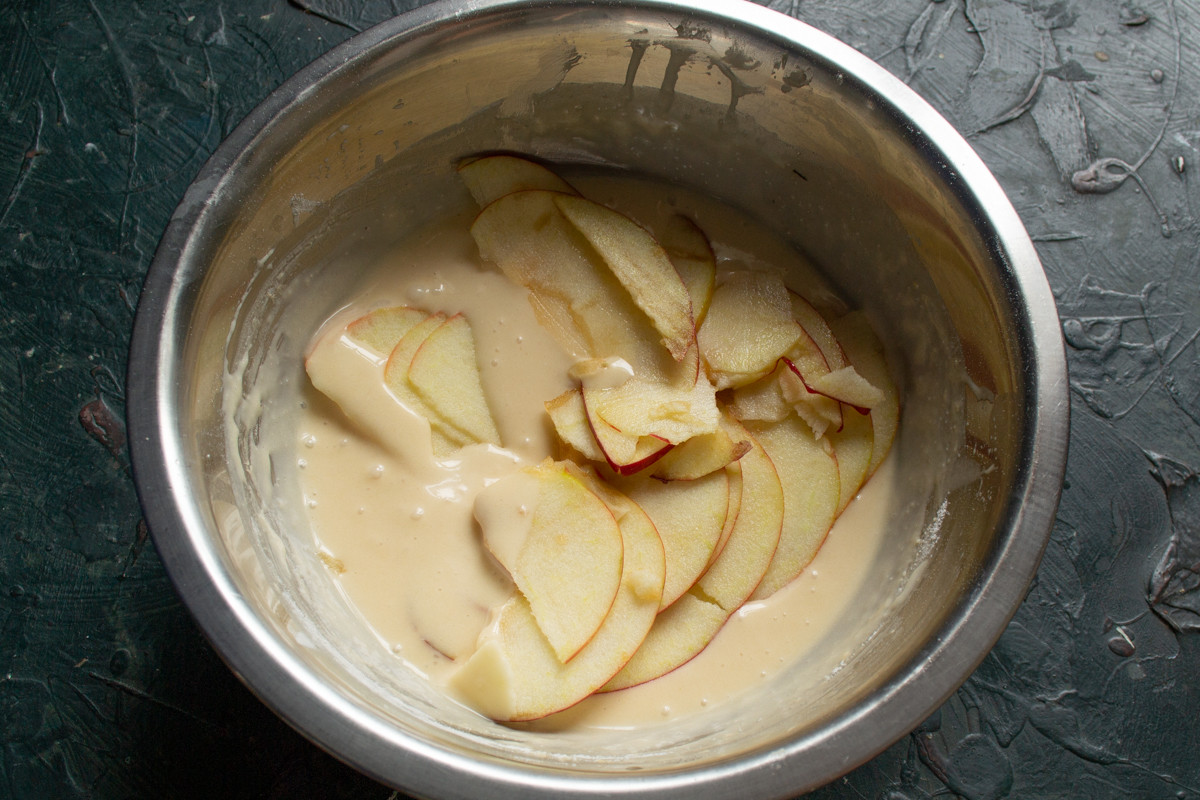 Подготовим форму для выпечки. Смазываем неразъёмную форму мягким сливочным маслом, посыпаем мукой. Ломтики яблок обмакиваем в тесто и выкладываем в форму.