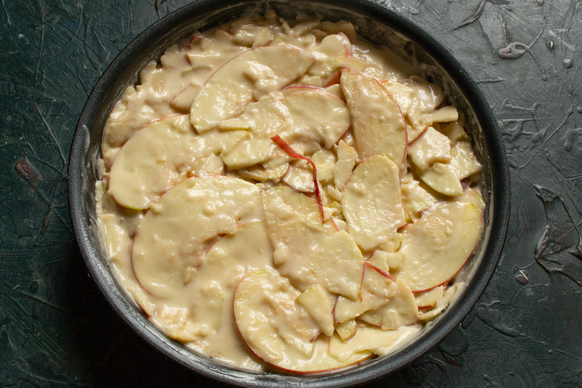 Нужно постараться и испачкать в тесте каждый ломтик, так пирог получится слоистым. Заполняем форму яблоками, выливаем сверху остатки теста. В этом рецепте форма диаметром 28 сантиметров. Разогреваем духовой шкаф до 175 градусов по Цельсию, ставим пирог в разогретый духовой шкаф на 25 минут.