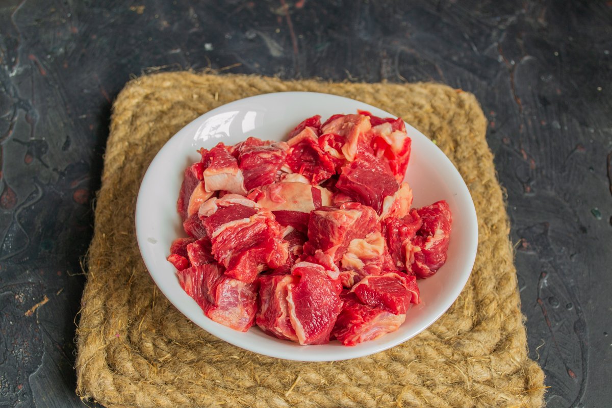 Делаем начинку для йоркширских пудингов. Котлетную говядину нарезаем небольшими кусочками. Котлетное мясо, на котором есть немного жирка — идеально подходит для начинки. Фарш, приготовленный из такого мяса, получится сочным.