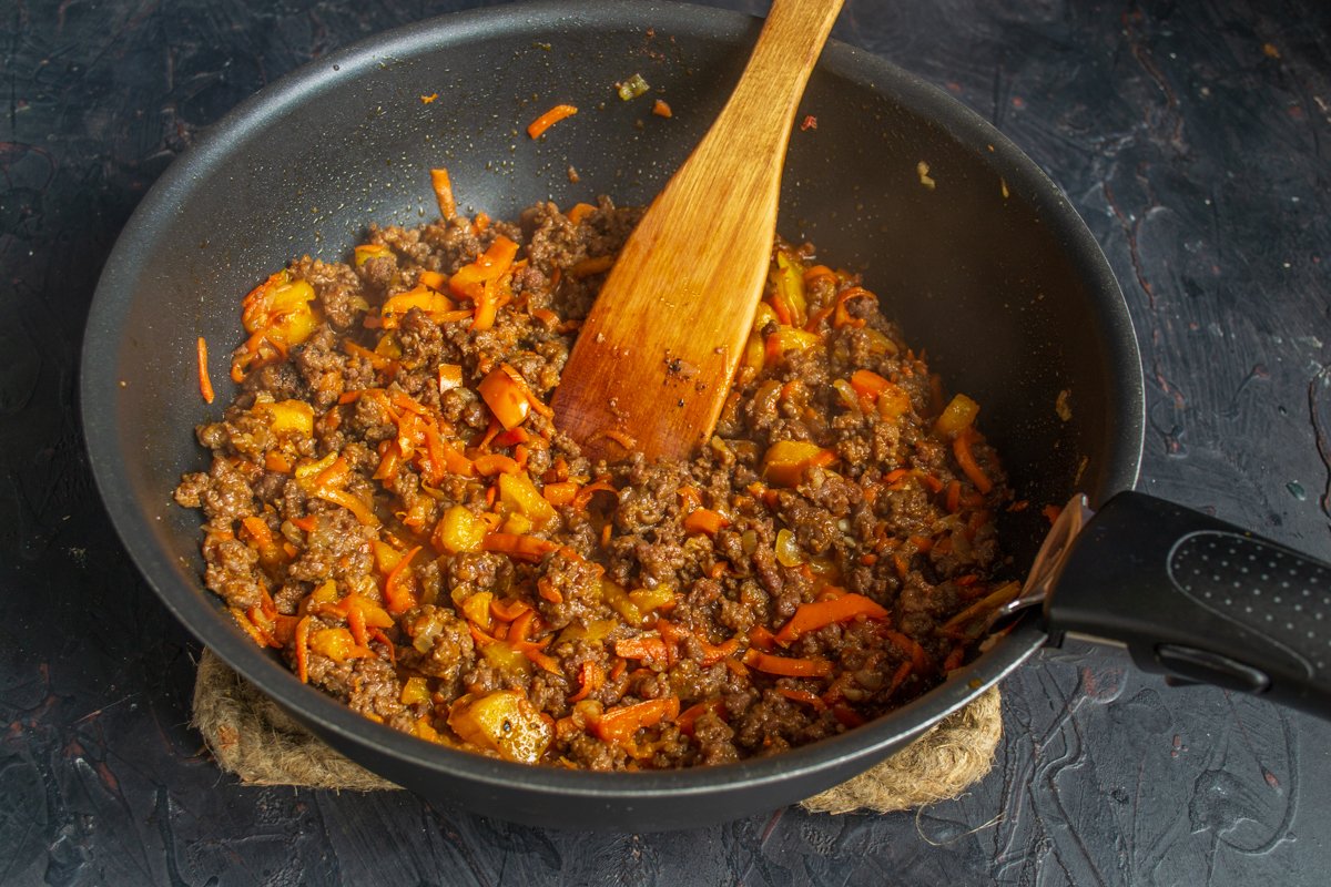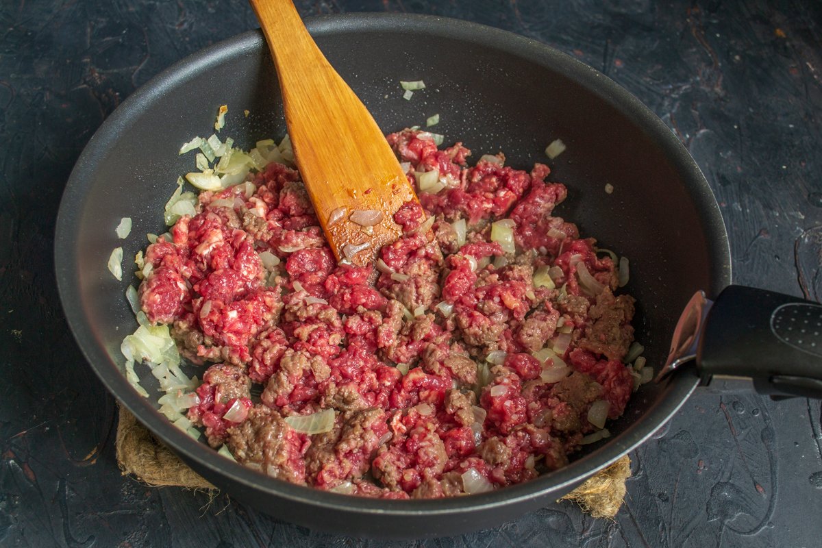 Наливаем в сковороду столовую ложку растительного масла, кладём мелко нарезанный лук и измельченные зубчики чеснока. Обжариваем овощи несколько минут, добавляем говяжий фарш. Разминаем фарш лопаткой, чтобы не образовывались комки. Обжариваем мясо с луком примерно 10 минут.