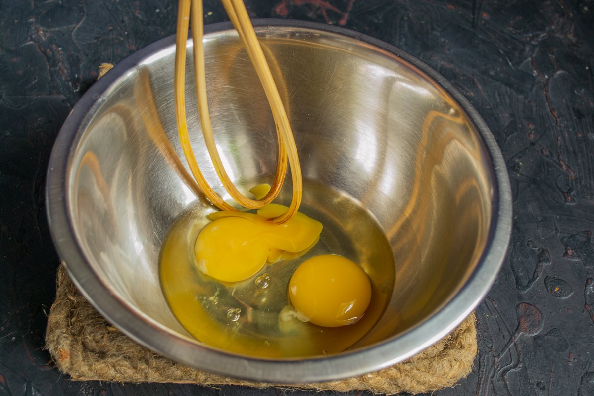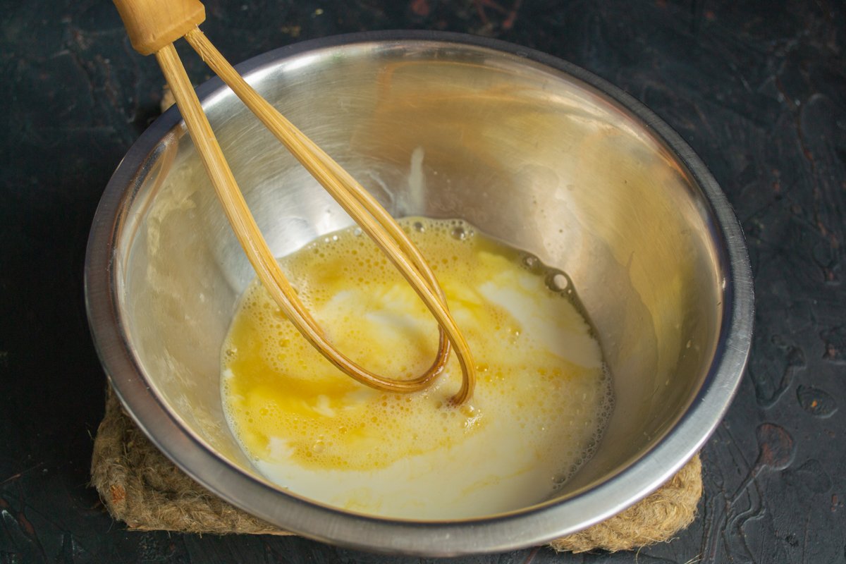 Взбиваем яйца с солью несколько минут венчиком, наливаем холодное молоко и ещё раз всё перемешиваем до однородности.